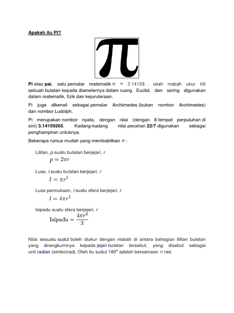 Dan huruf Yunani π pi mewakili nisbah lilitan bulatan dengan diameternya. V 4 3 π r3. 3 x 5 10.